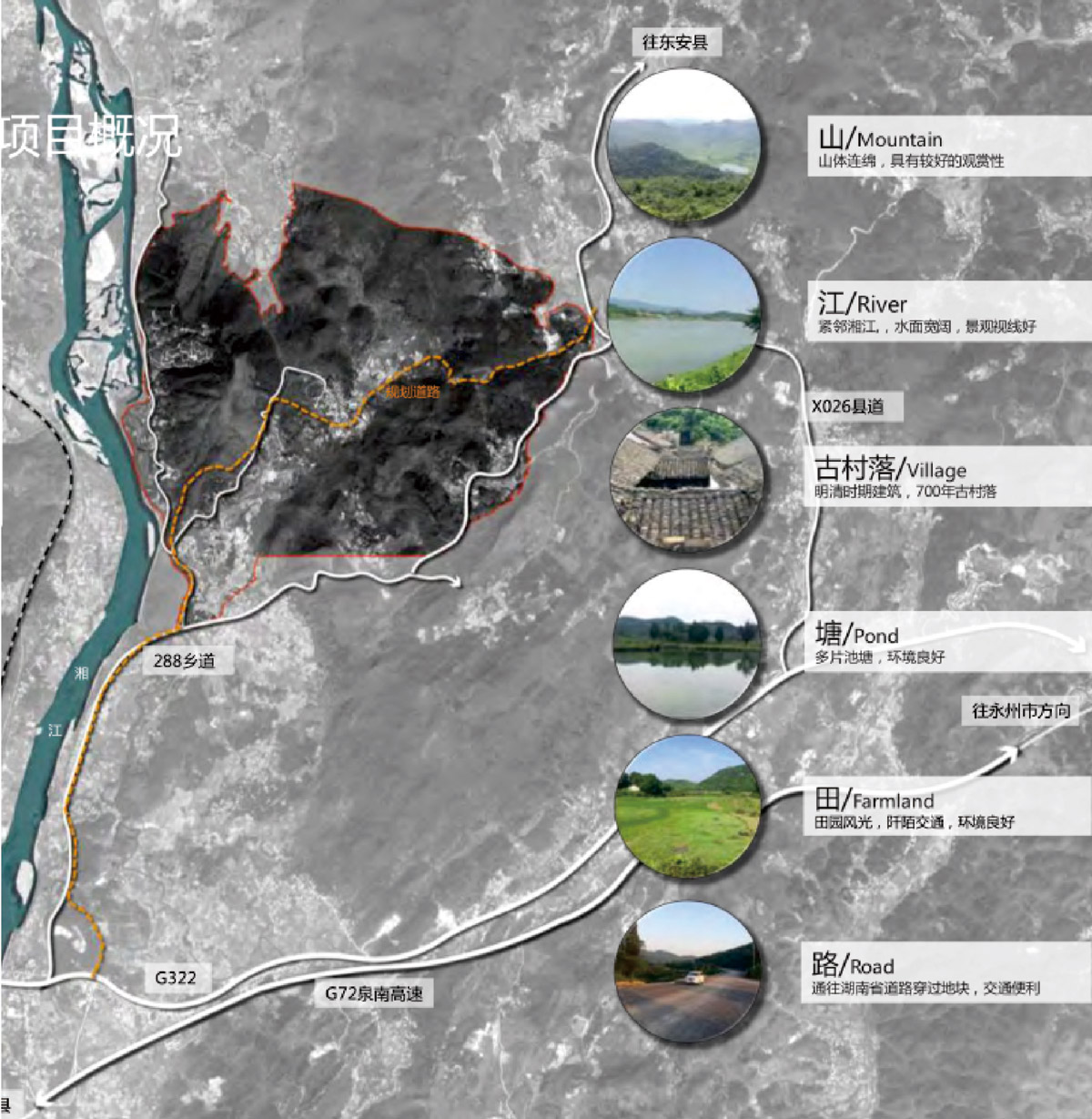 ? ? ?? 項(xiàng)目規(guī)劃總面積約8.3平方公里(約12415畝),主要由林田地、山丘與湘江水面組成,是以規(guī)劃區(qū)風(fēng)山體佇立,形成自然風(fēng)鵬金所面貌景觀,并有少量住宅用地、農(nóng)田用地和交通道路用地,自然生態(tài)環(huán)境較好,用地條件較好。